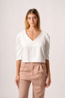 BLUSA CEY FOIL CUELLO V MANGA 3/4 HOMBRO FRUNCIDO BOTON ATRAS Y PARA ATAR